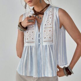 Blue and White Striped Lace – Embroidered Sleeveless Top