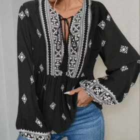 Blue Embroidered V – Neck Flared – Sleeve Bohemian Dress