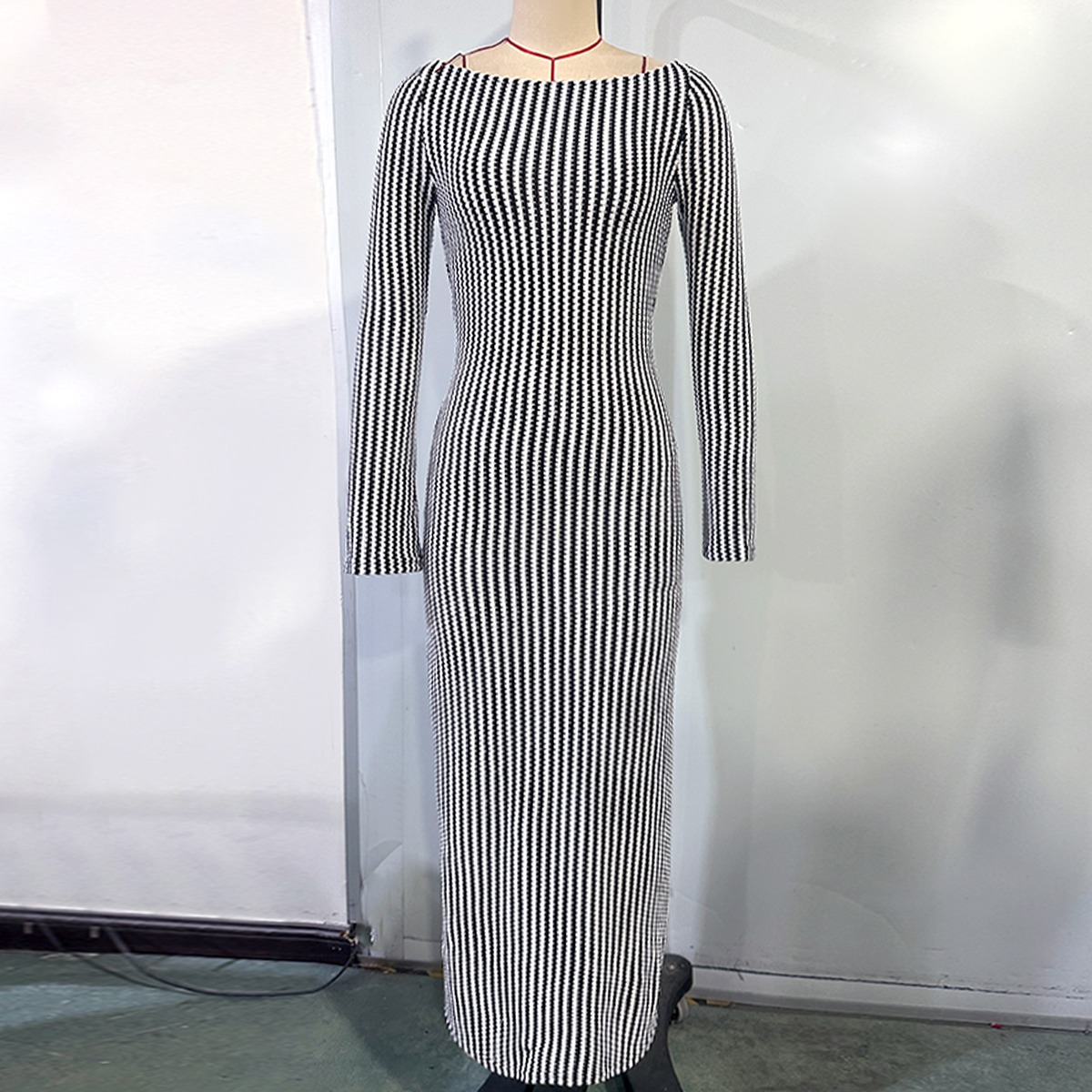 Shop Black – and – White Striped Off – Shoulder Long – Sleeved Slim – Fitting Maxi Dress