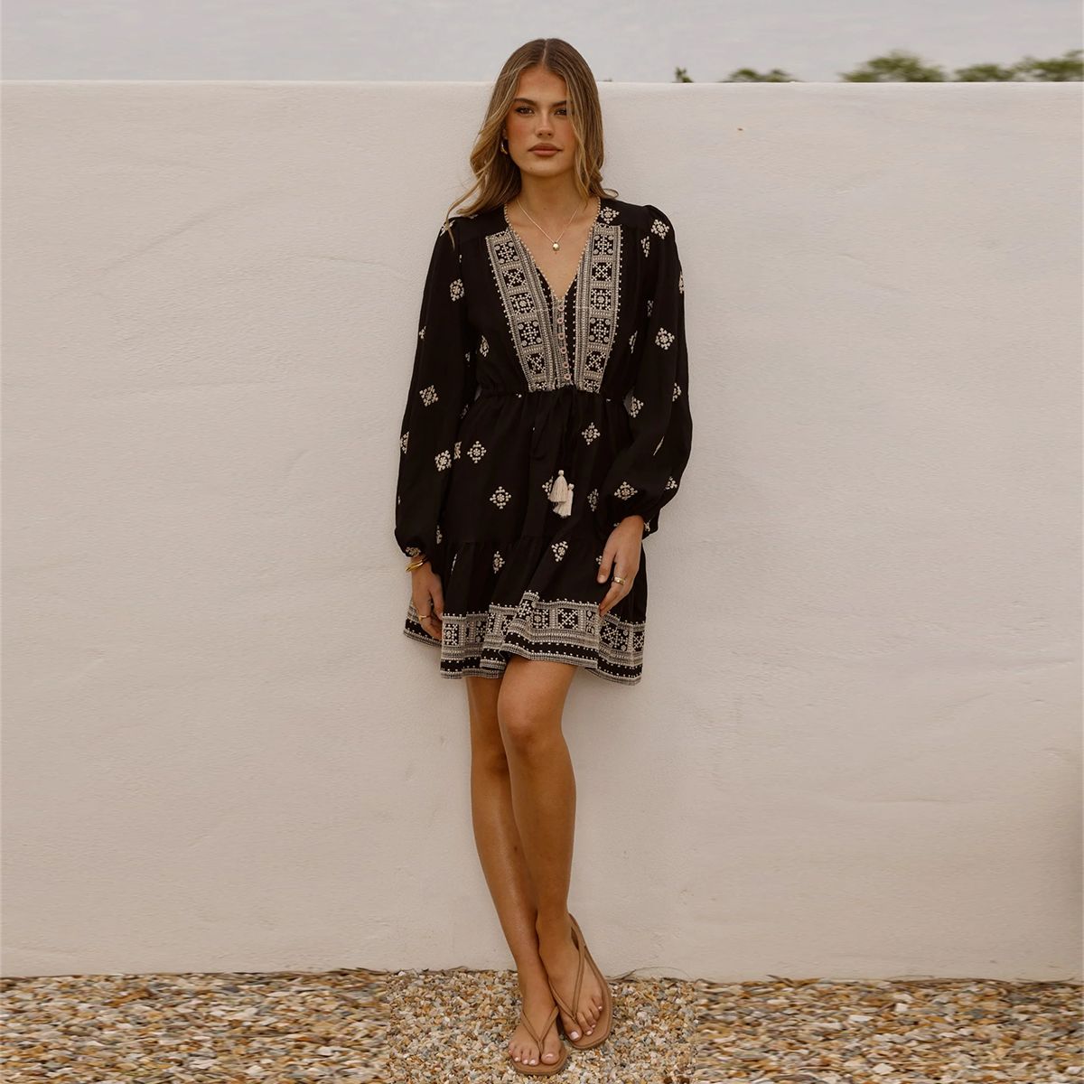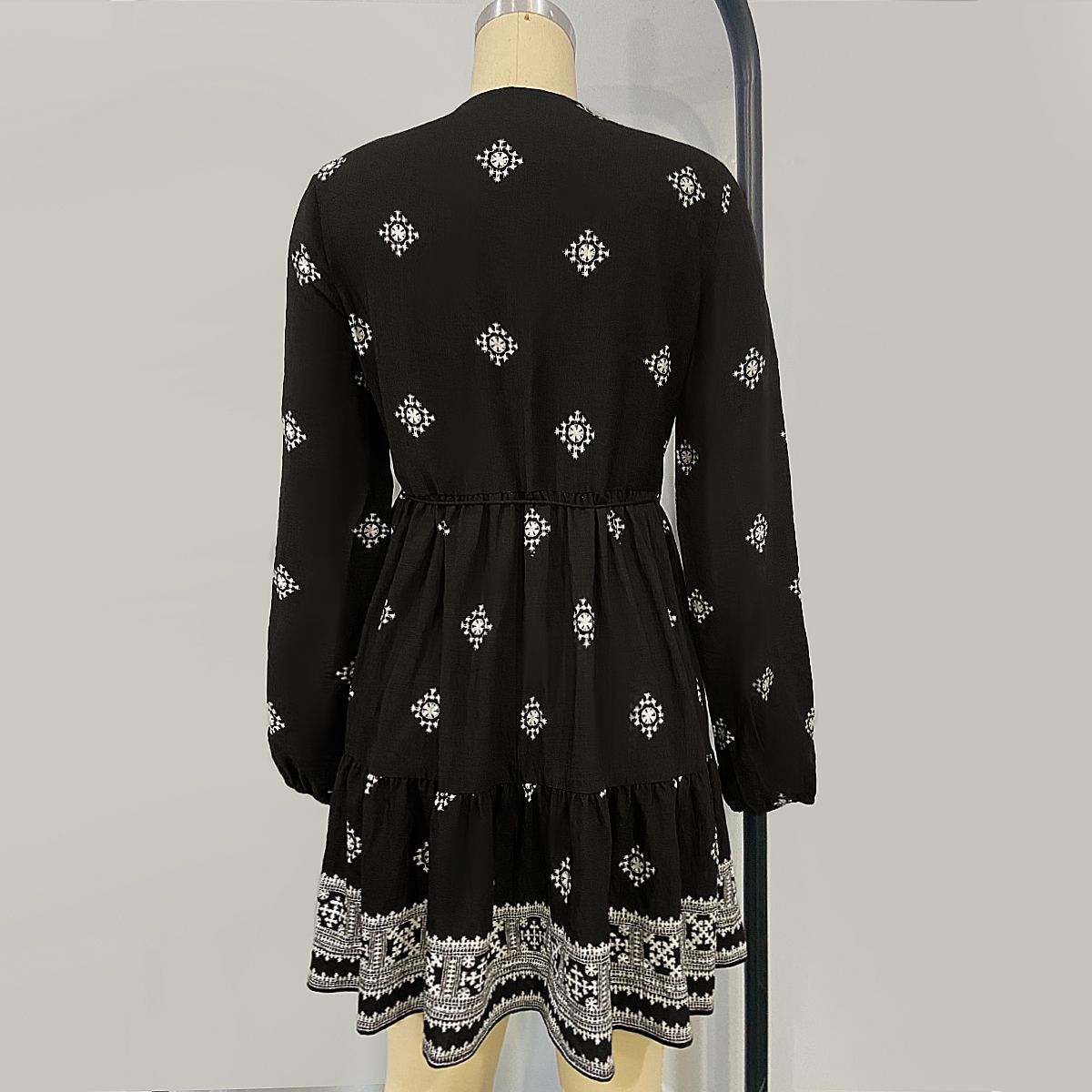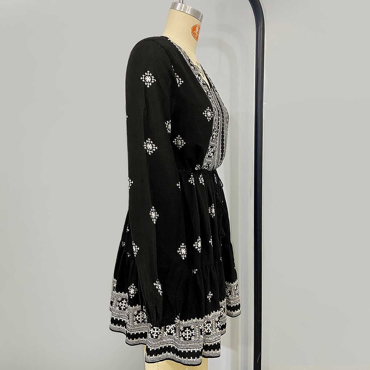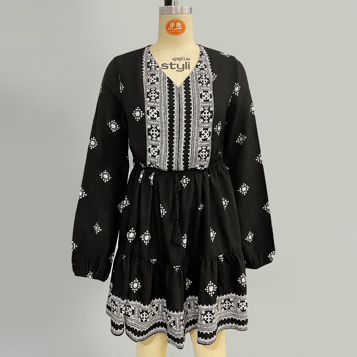 Clothing Introduction: The skirt takes classic and versatile black as the base color, and is carefully dotted with a large number of exquisite white ethnic – style embroidery patterns. These patterns have unique shapes and delicate lines, as if telling mysterious foreign stories, adding rich cultural heritage and artistic atmosphere to the skirt.