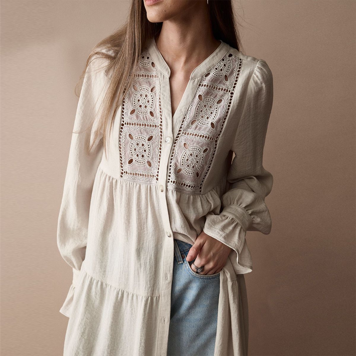 Shop Off – White Long – line Shirt with Hollow – out Embroidery