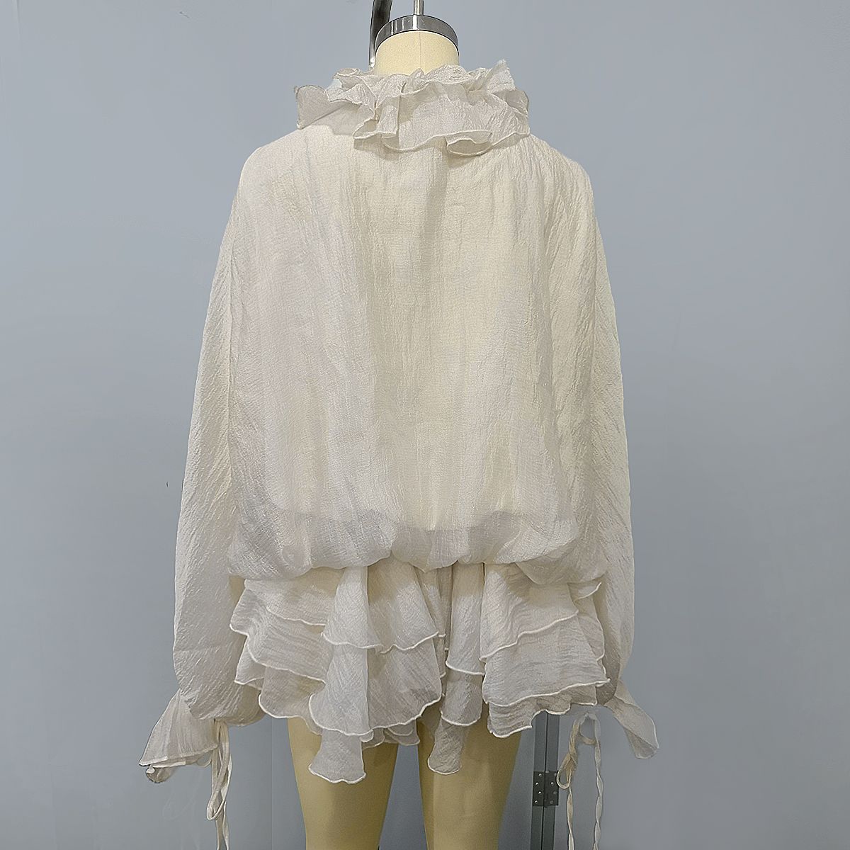 This is an off – white top that is extremely romantic and gorgeous, and the overall design is full of exquisite details and artistic sense. The neckline and the front of the chest are carefully crafted with layers of ruffled decorations. These ruffles are like blooming flowers, clustered together, creating a soft and highly visually impactful effect, and naturally becoming the absolute visual focal point of the entire top, instantly catching people’s eyes.