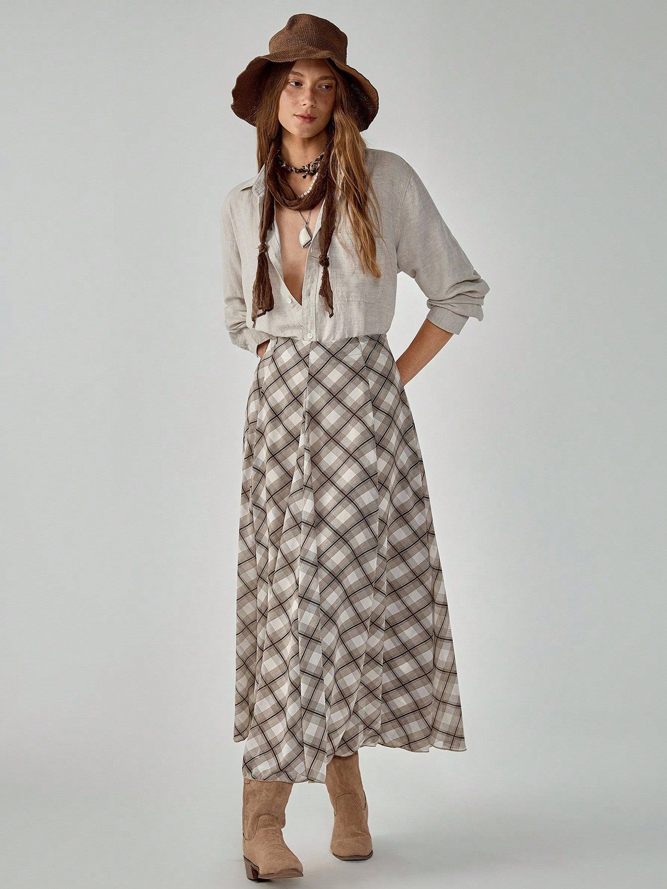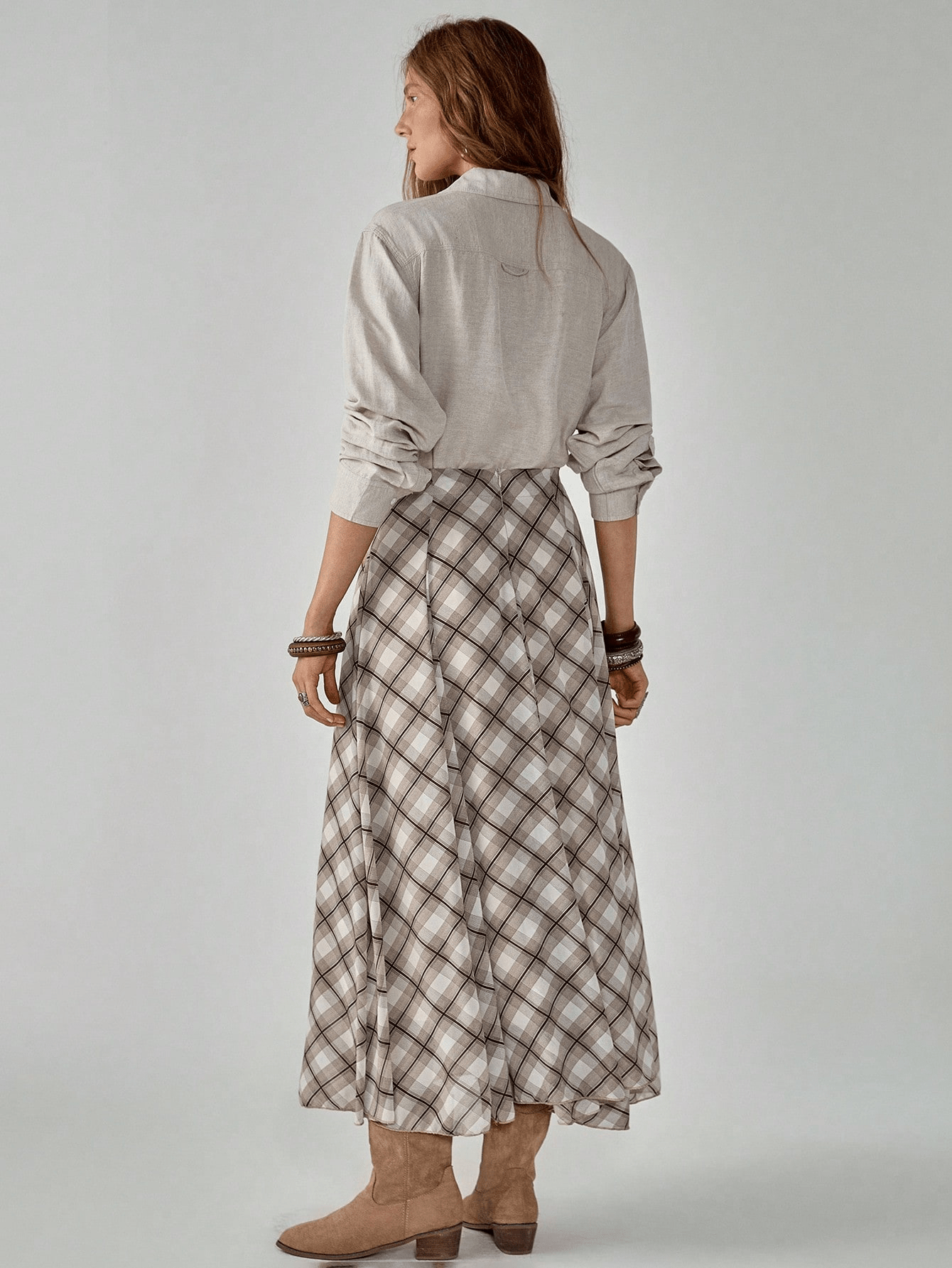 This plaid midi skirt is replete with retro allure. The timeless plaid motif radiates an artistic temperament, effortlessly crafting a laid-back and free-spirited style. Boasting a sleek silhouette and an impeccably tailored length, it flawlessly contours the leg lines. When paired with a minimalist top, it shines brilliantly. Whether for a casual daily outing or a sophisticated date, it enables you to fully exhibit your distinctive charm and effortlessly make a striking impression in the crowd.