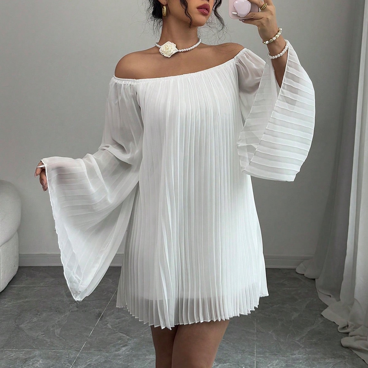 Product Name : White Off – the – Shoulder Pleated Bell – Sleeve Mini Dress