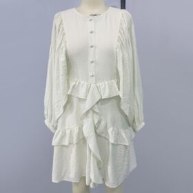 Cream – Colored Round – Neck Puff – Sleeve Ruffled Dress