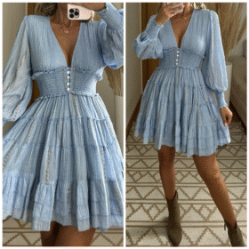 Light Blue Deep V-neck Lantern Sleeve Ruffled Waist-fitted Dress